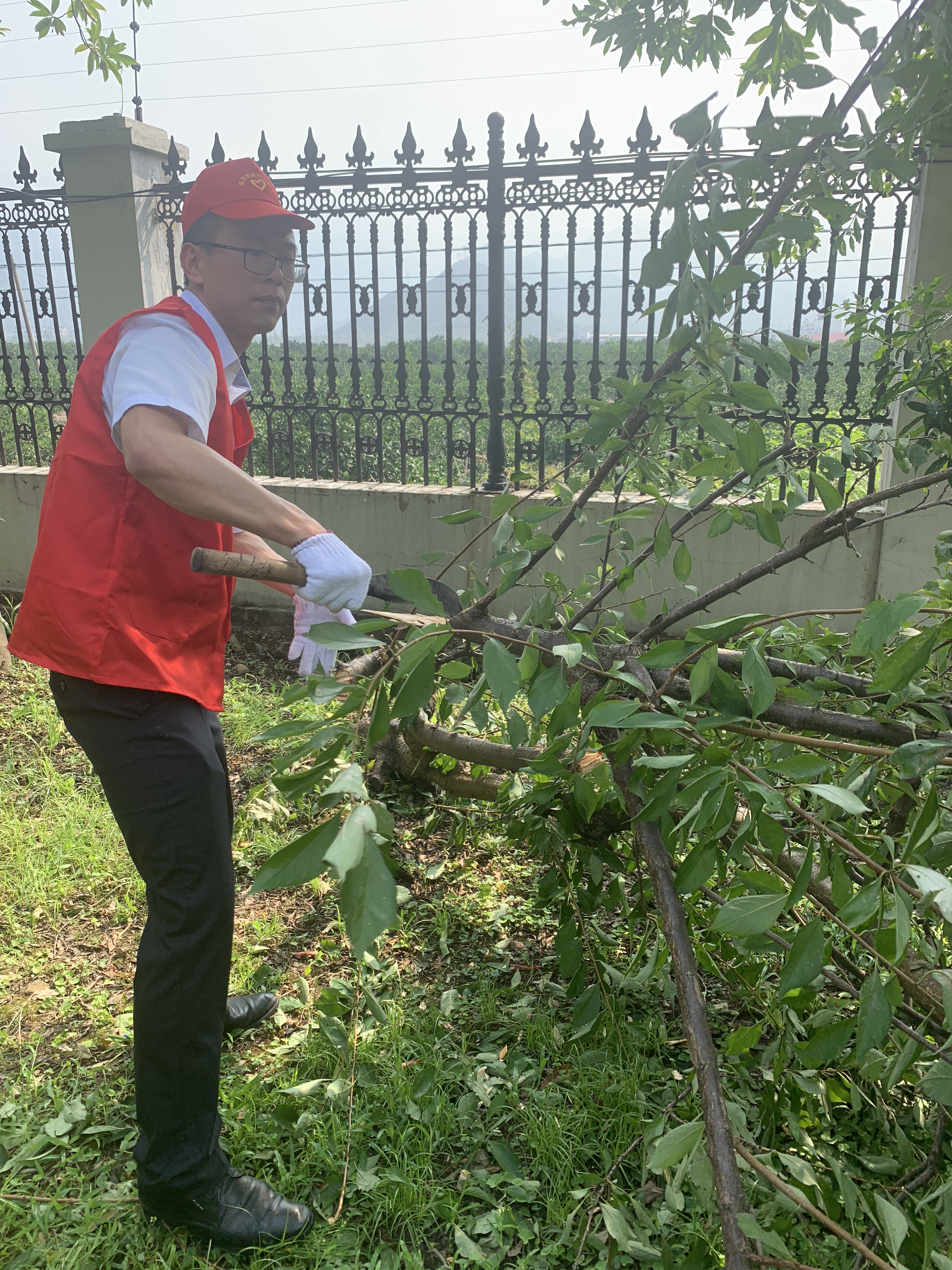活動(dòng)過程中,孫明偉、杜廣勝、楊堅(jiān)等同志一行先查看了配電房周邊綠化帶,看到有樹木倒伏,壓在防護(hù)網(wǎng)上,存在較大安全隱患,他們二話不說(shuō)立即手拿砍刀,對(duì)樹木進(jìn)行切割處理,并由李學(xué)平、包德福等人安排拉車將斷木等清理干凈
