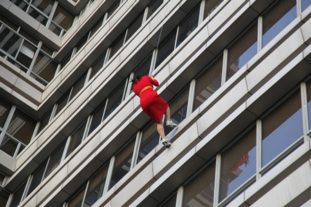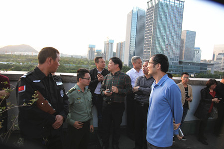 培訓結束后,參會人員集體到集團大樓5樓外平臺觀摩高層緩降逃生演練。在演練中,2名模擬被困人員先后使用高層緩降逃生設備從16樓窗口平安緩降逃生到5樓平臺。之后通過演練和講評,大家進一步熟悉了高層緩降逃生設備及使用方法,拓展了高層建筑逃生思路。