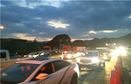 3月4日驚蜇雷鳴,大雨瓢潑,大批車(chē)輛涌向溫嶺西收費(fèi)所出口。