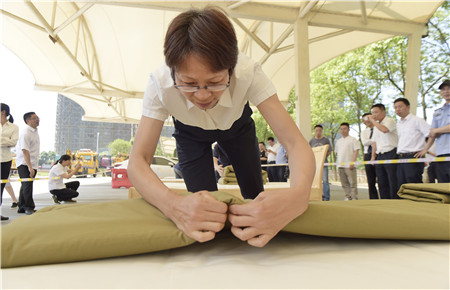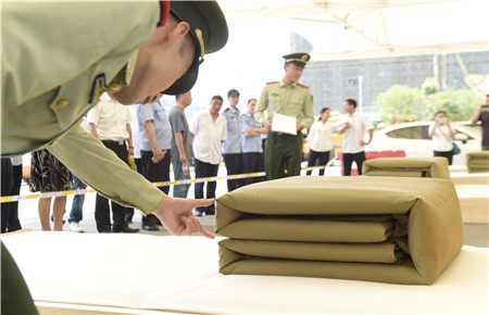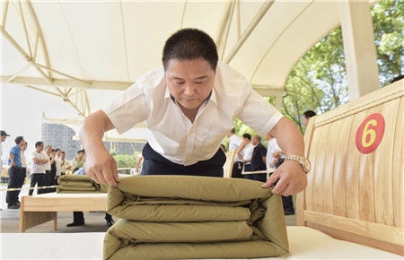 這是集團2018年技能大比武中內(nèi)務(wù)項目比賽中的一個場景。此次內(nèi)務(wù)比賽由公司大樓、所、中心、子公司共挑出33名代表參加,比賽特邀黃巖消防大隊兩位教官擔任裁判。