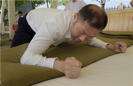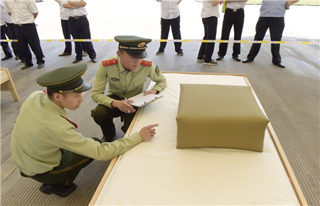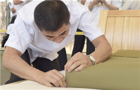 教官用手量量被子上下厚度,四周細細觀察,在兩床“豆腐塊”被子之間反復來回查看了幾遍,又與另一個教官指指點點商量了好久,不僅是參賽者,圍觀者都開始緊張了。確實,按照內(nèi)務(wù)整理要求,這兩床已被疊成豆腐塊的被子折得有棱有角,被面光滑,上下勻稱,外行人看來就是一模一樣的完美,沒有任何區(qū)別了?!白屗麄兌紩x級吧。”旁觀者說。教官笑著搖搖頭,對大家解釋道:“3號床勝出,因為它是雙面折法,在規(guī)定時間內(nèi)兩面修整程度都一樣平整,這樣比起來,5號床稍遜一籌?!?/span>